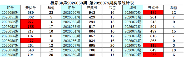 富腾优配上期追念:福彩3D第2026079期奖号为:233,其中奖号组选类型为:组三,奇偶比为2:1,大小比为0:3,012路比为2:0:1,和值为8,跨度为1。