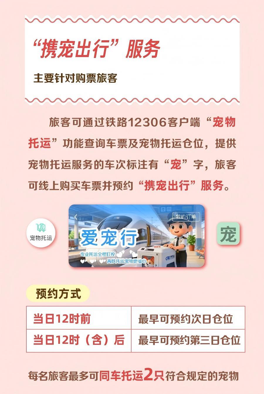 自2026年4月8日起,铁路部门在前期高铁宠物托运工作成效试行的基础上,推出“爱宠行”工作,提供“携宠出行”与“爱宠单独行”两种托运口头,办理宠物托运业务的高铁站增至121座、列车增至228趟,将更好地自豪搭客各种化需求。
