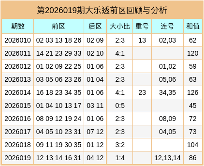 当期前区号码大小比为1:4,三区比为1:3:1,奇偶比为2:3。