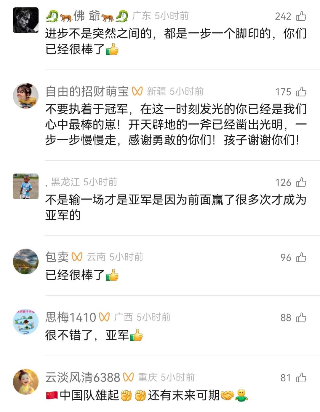 球迷鼓励道“不是输了一场比赛获得亚军,是赢了前面所有比赛才获得亚军”,“保持清醒,正视差距”,股市大盘行情“已经很棒了”。