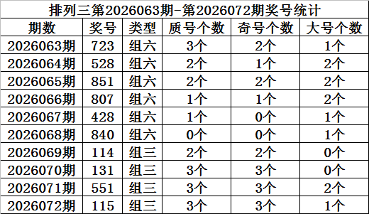 上期纪念:胪列三第2026072期开奖:115,质合比为3:0,奇偶比为1:2,大小比为3:0。