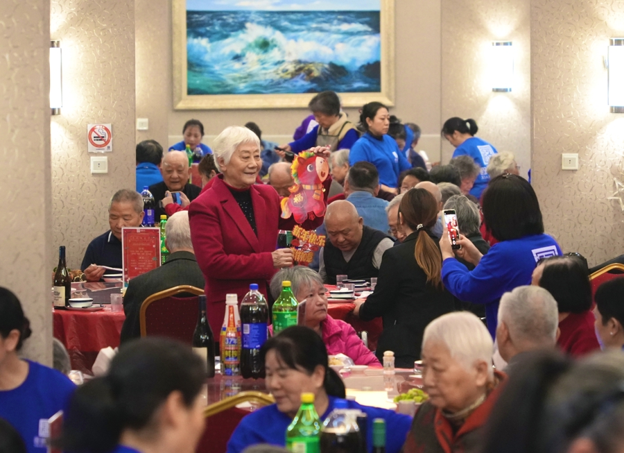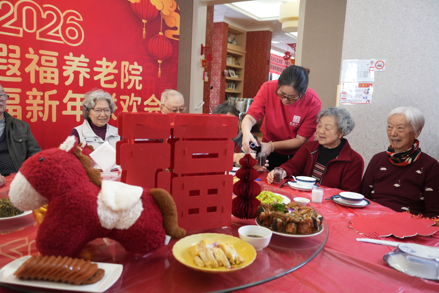 2月15日,上海遐福养老院张灯结彩喜气洋洋,老东谈主欢聚一堂吃年夜饭迎新纳福。