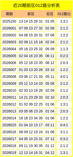 详细分析,第26020期大乐透前区012路比参考2:2:1。
