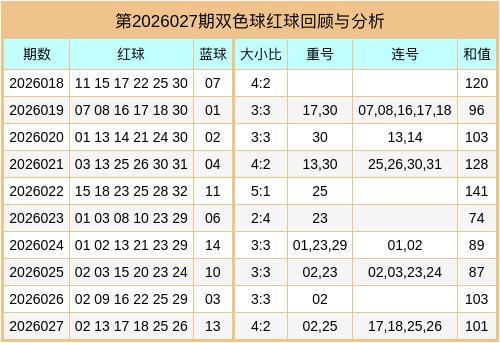 其中红球开出2枚重号02,25,开出2组连号17,18,25,26,蓝球开出大数13。