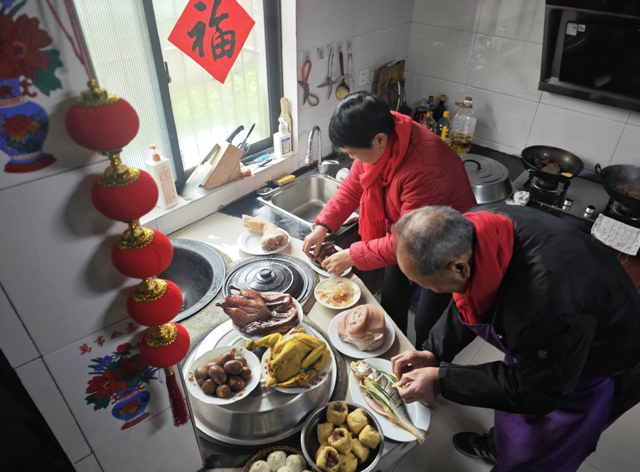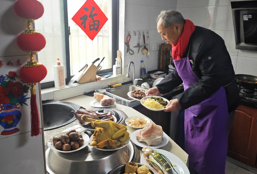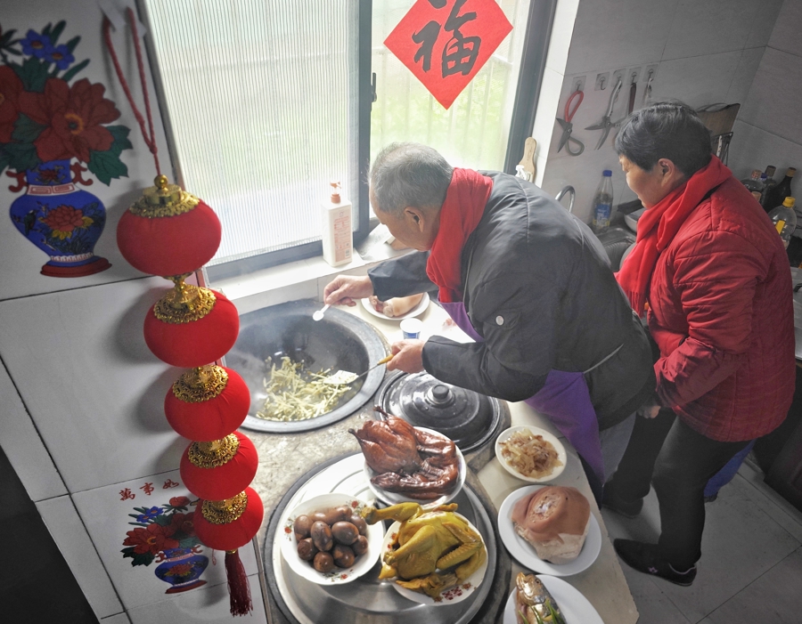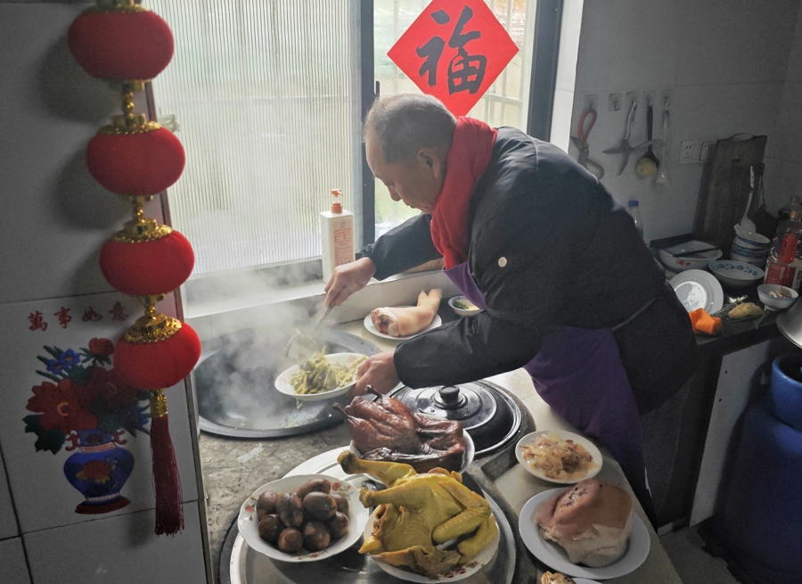 2月16日是除夜,金山区山阳镇渔业村2组村民沈会云家忙着张罗除夕饭。