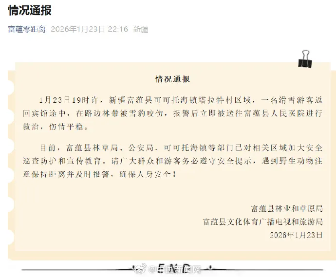 23日晚,富蕴县林业和草原局、富蕴县文化体育广播电视和旅游局通报:1月23日19时许,新疆富蕴县可可托海镇塔拉特村区域,一名滑雪游客返回宾馆途中,在路边林带被雪豹咬伤,报警后立即被送往富蕴县人民医院进行救治,伤情平稳。目前,富蕴县林草局、公安局、可可托海镇等部门已对相关区域加大安全巡查防护和宣传教育。请广大群众和游客务必遵守安全提示,遇到野生动物注意保持距离并及时报警,确保人身安全!