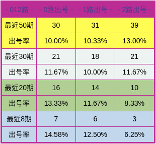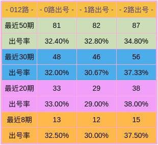 举座走势:通过50期数据对比看,2路较热,1路、0路开出率略低。